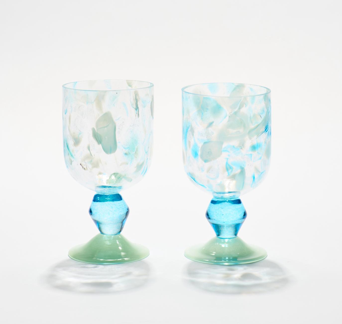 The speckled tumblers and sweetie glasses within this collection utilised the frit from the recycled glass in the studio.