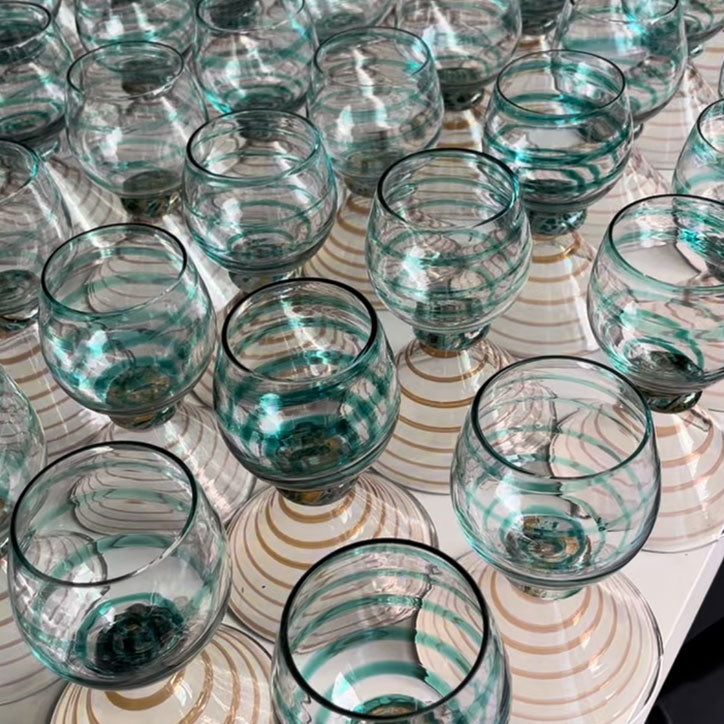 The glassblowing team worked on the unique glassware designs over a few weeks in the hot glass studio. It was a fun challenge to create the versatile shape!