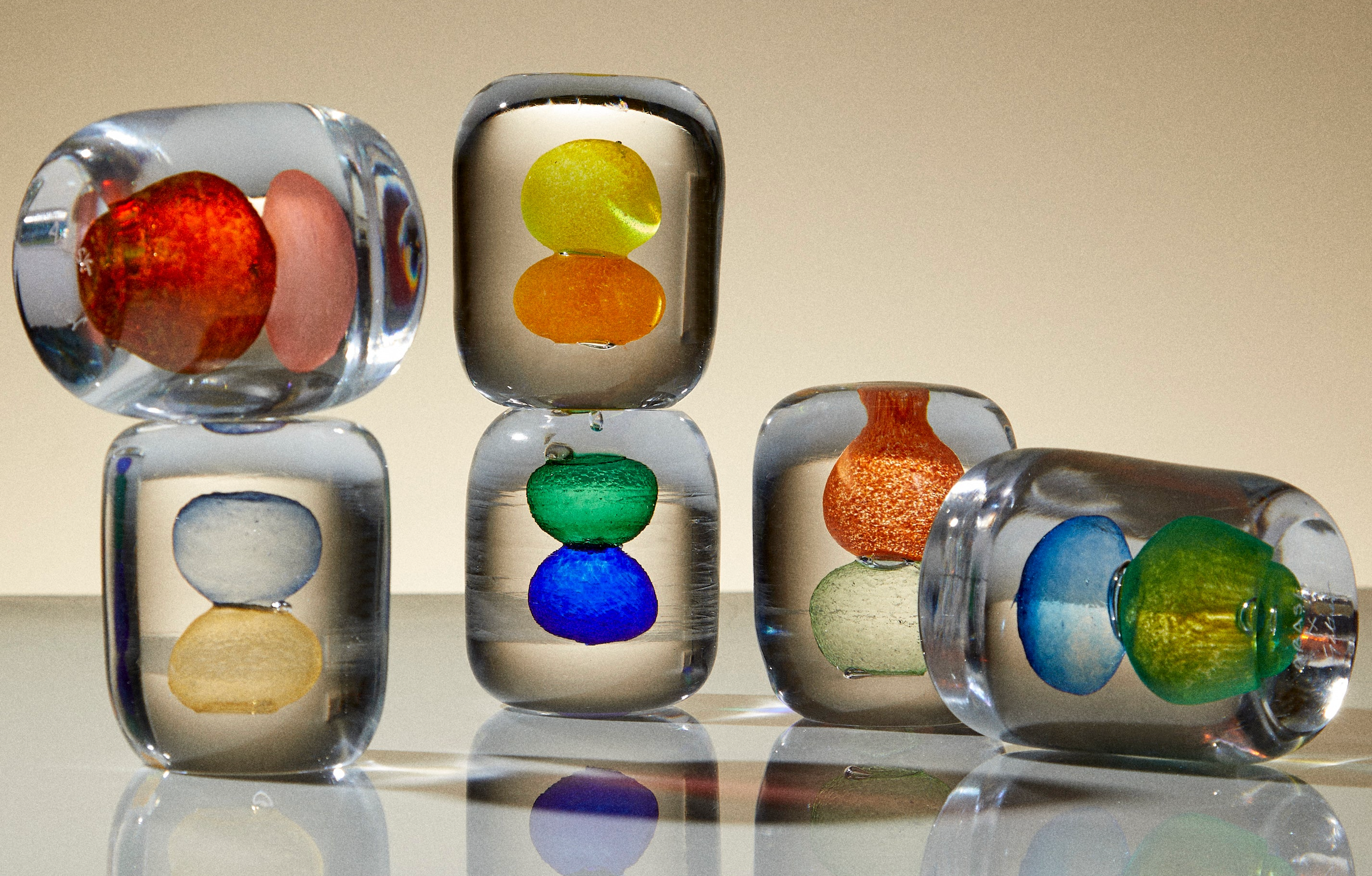 We are delighted to introduce our exclusive collaboration with ABASK: a collection of hand-blown paperweights, each one crafted as a small sculpture of colour and light. Offered in six luminous colourways, every piece begins with two molten gathers of glass, joined, shaped, and signed by hand in our studio.