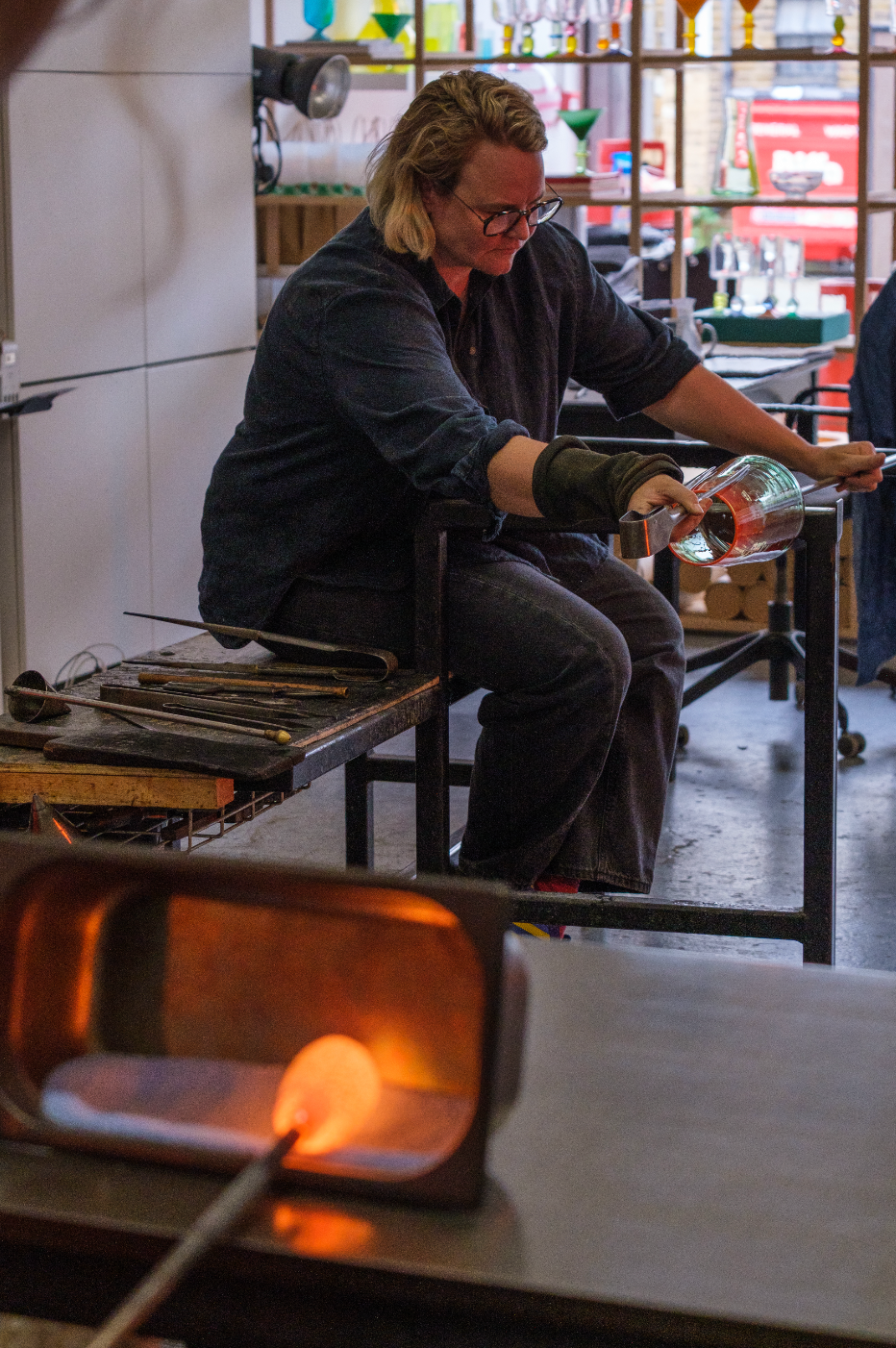 For Gather founder Phoebe Stubbs, whose practice is rooted in a deep, ongoing devotion to glassmaking, the commission continues an exploration of material, colour, and form developed within our working glassblowing studio in London. Each piece emerges directly from this environment - shaped through heat, rhythm, and hands-on production at the bench.