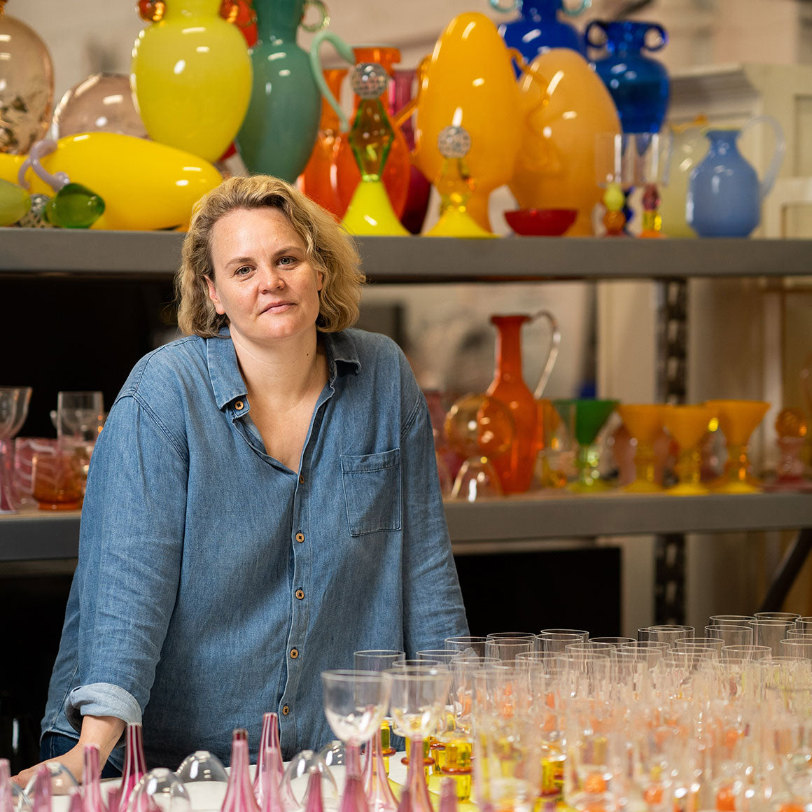 Phoebe Stubbs is a glassmaker and designer and has been glassblowing for 18 years. She has a deep respect for glassmaking's tradition, history and hand-skills. Each piece she designs and makes mimics historical forms, but exaggerates them in shape and colour to create a contemporary artwork for your table, all signed by the maker.