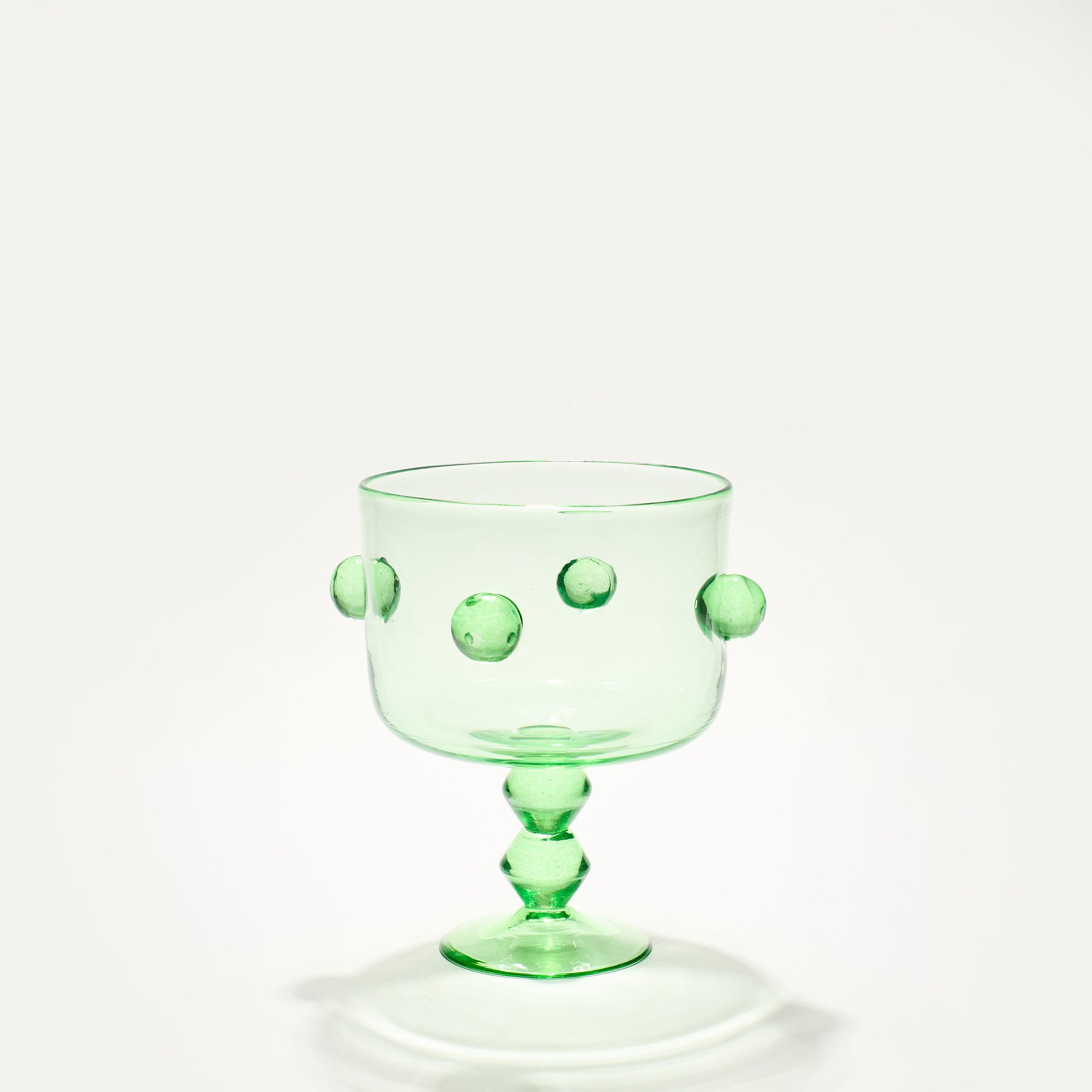 The exaggerated shape is created by blowing bold colours of glass which is then joined with solid worked glass for the handles and stem.