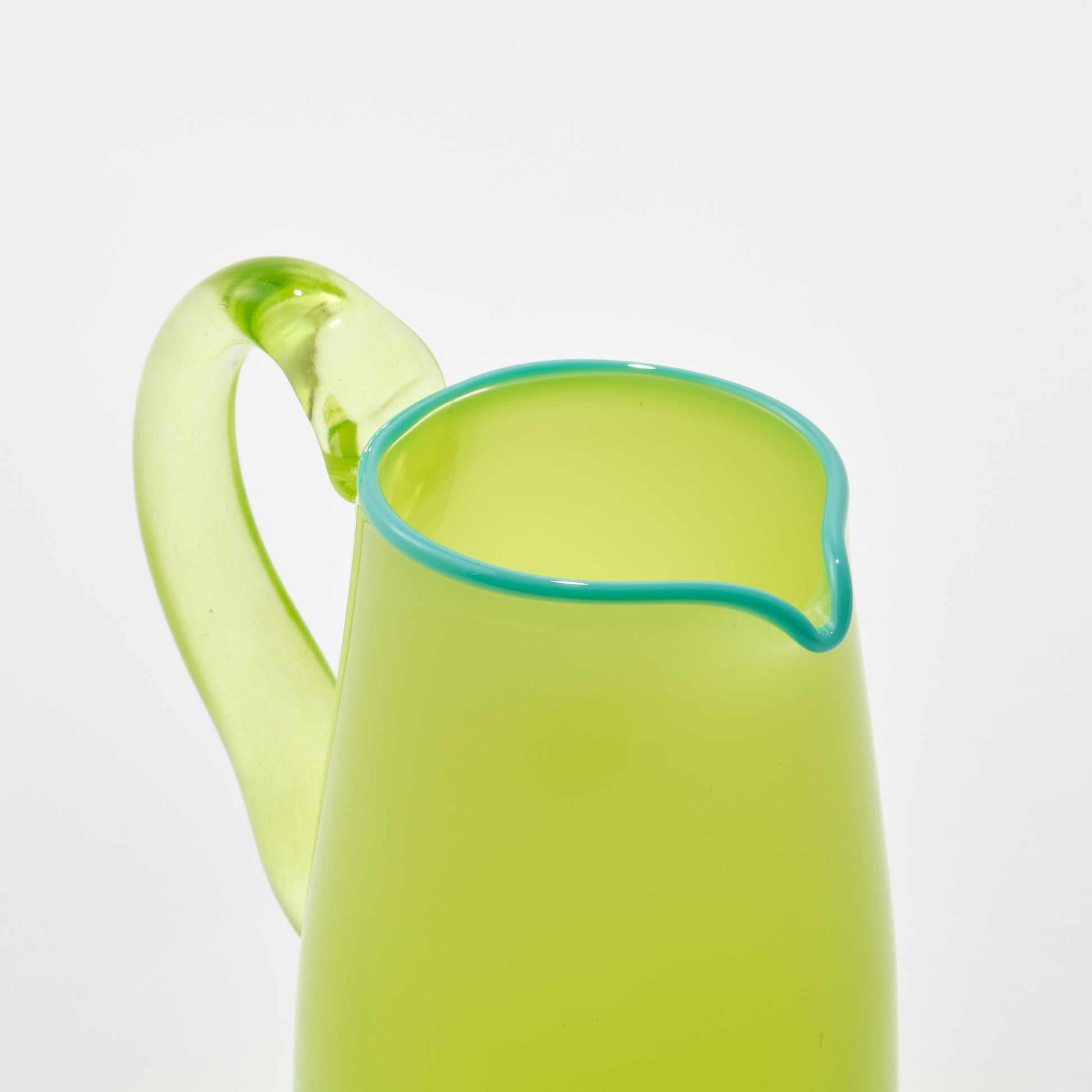 Hand blown, opaque apple green glass milk jug featuring a lime green handle and contrasting celadon lip.