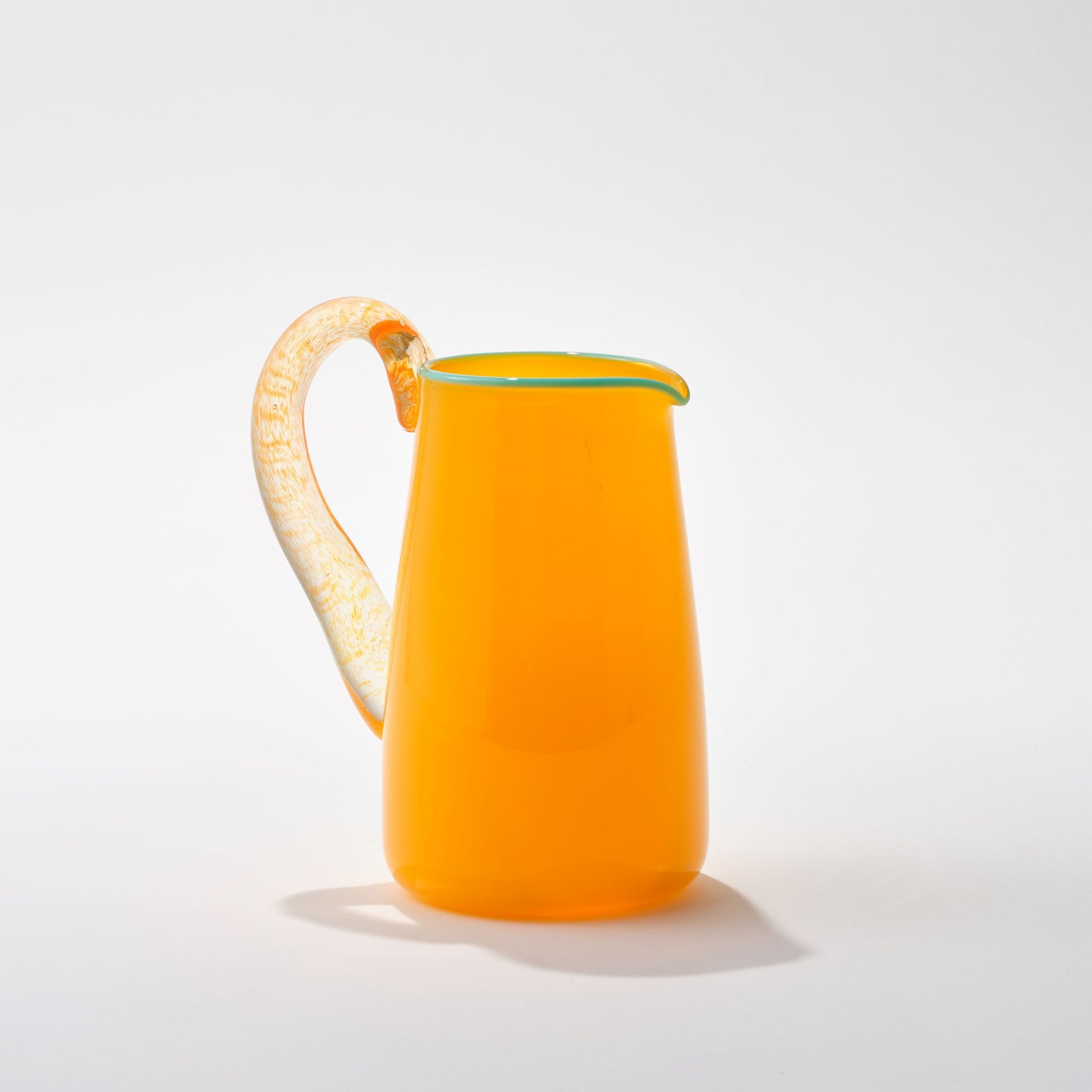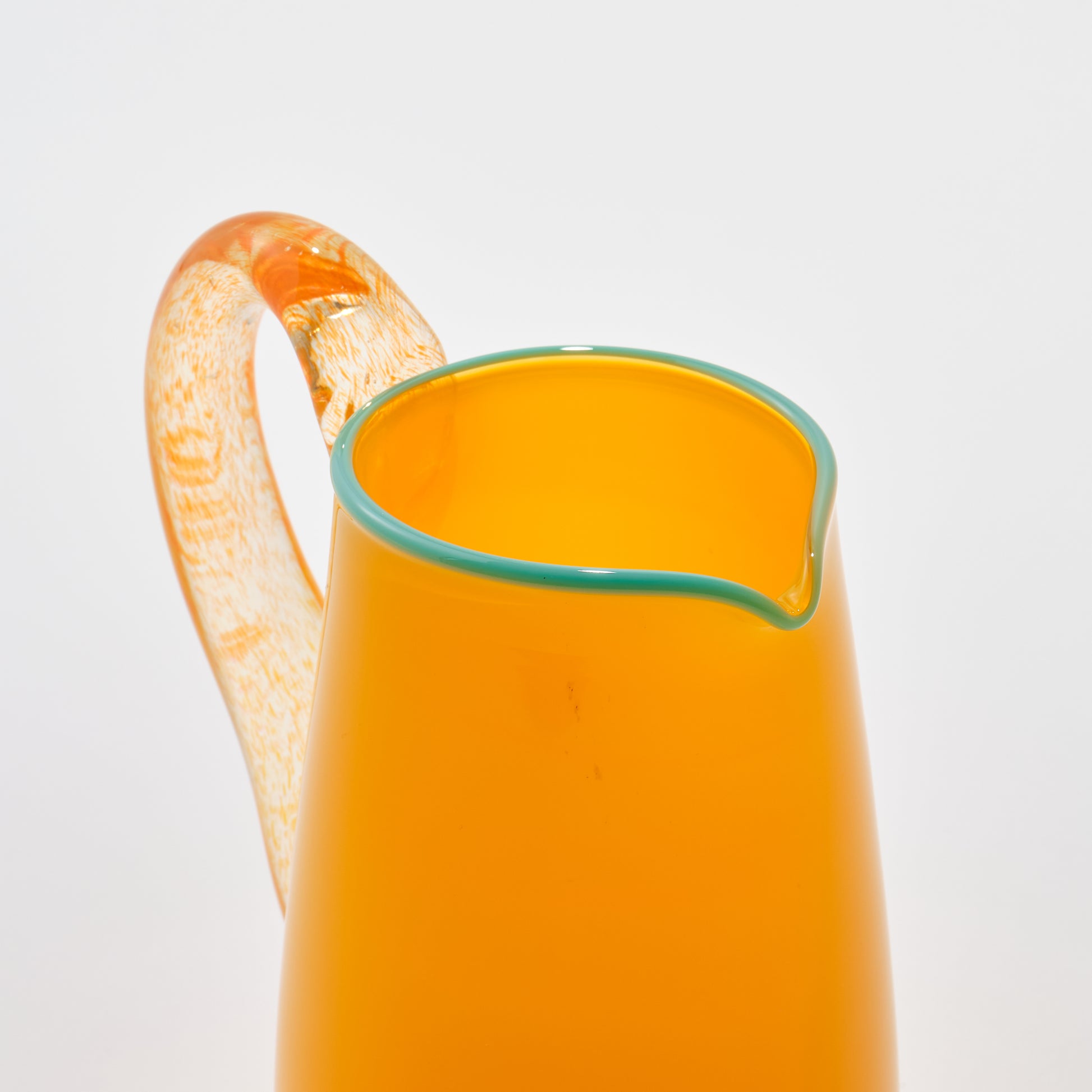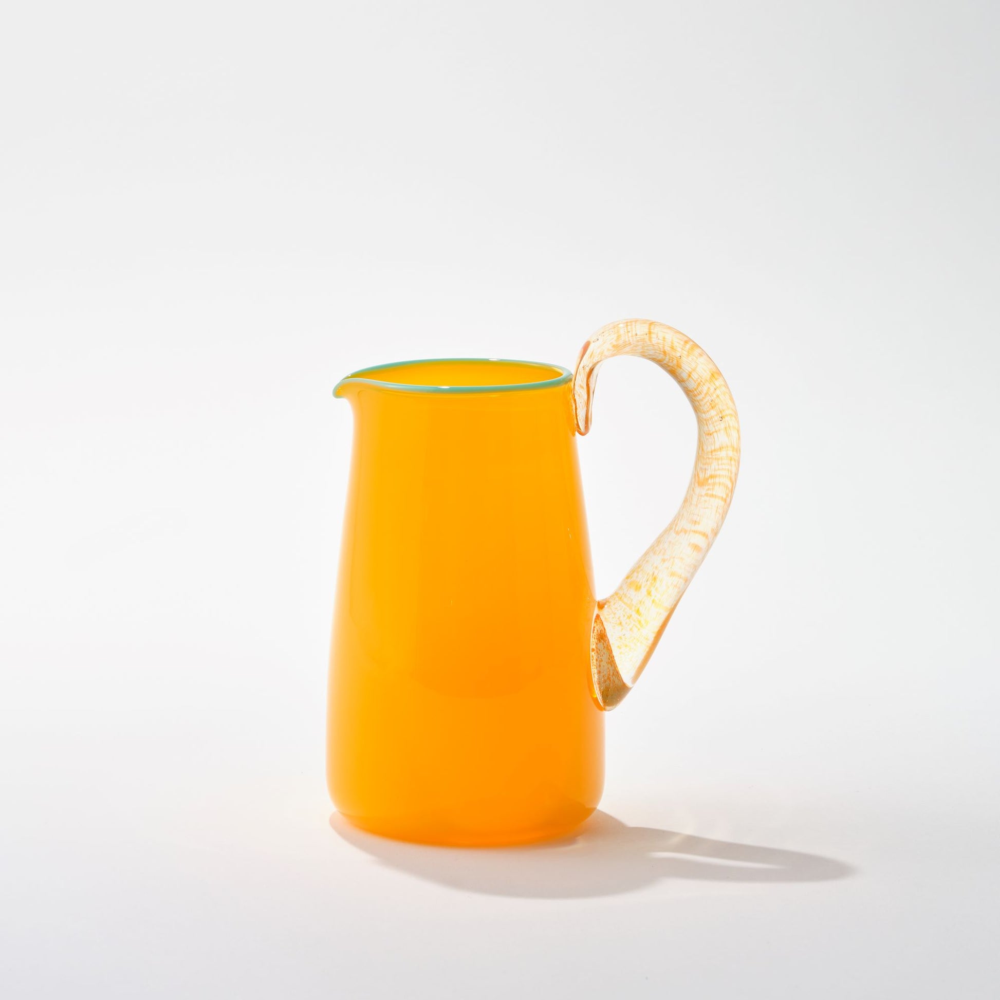 Hand blown, opaque marigold glass milk jug featuring a gold handle and contrasting celadon lip.