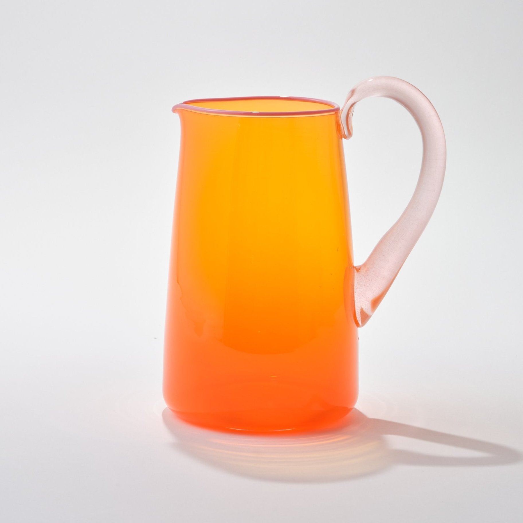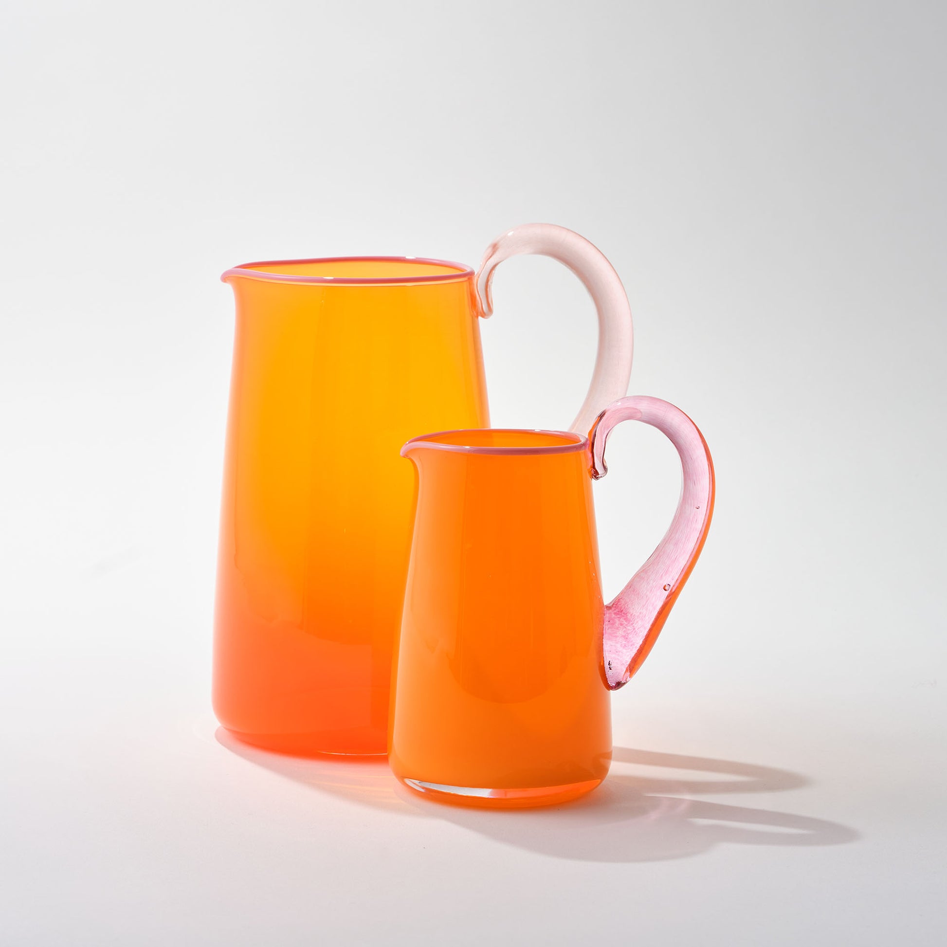 Hand blown, transparent orange glass jug with blush handle and contrasting pale pink lip.