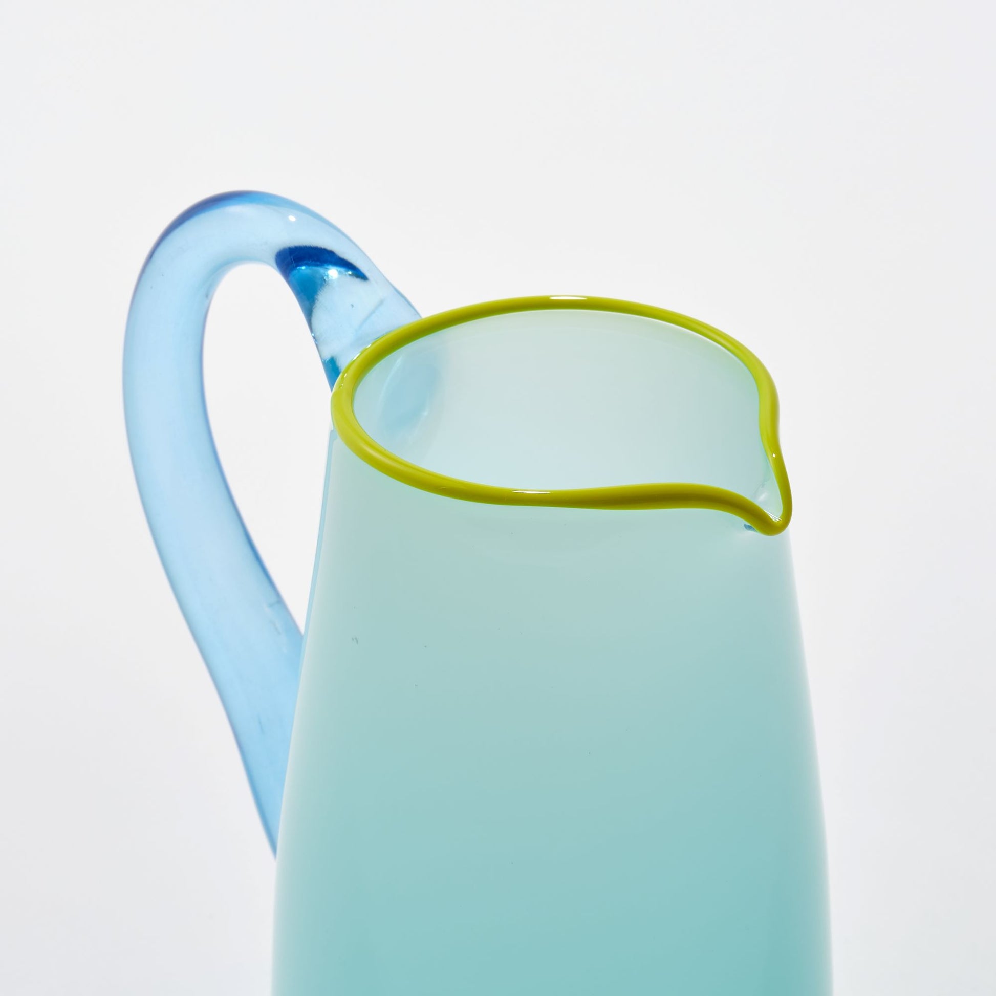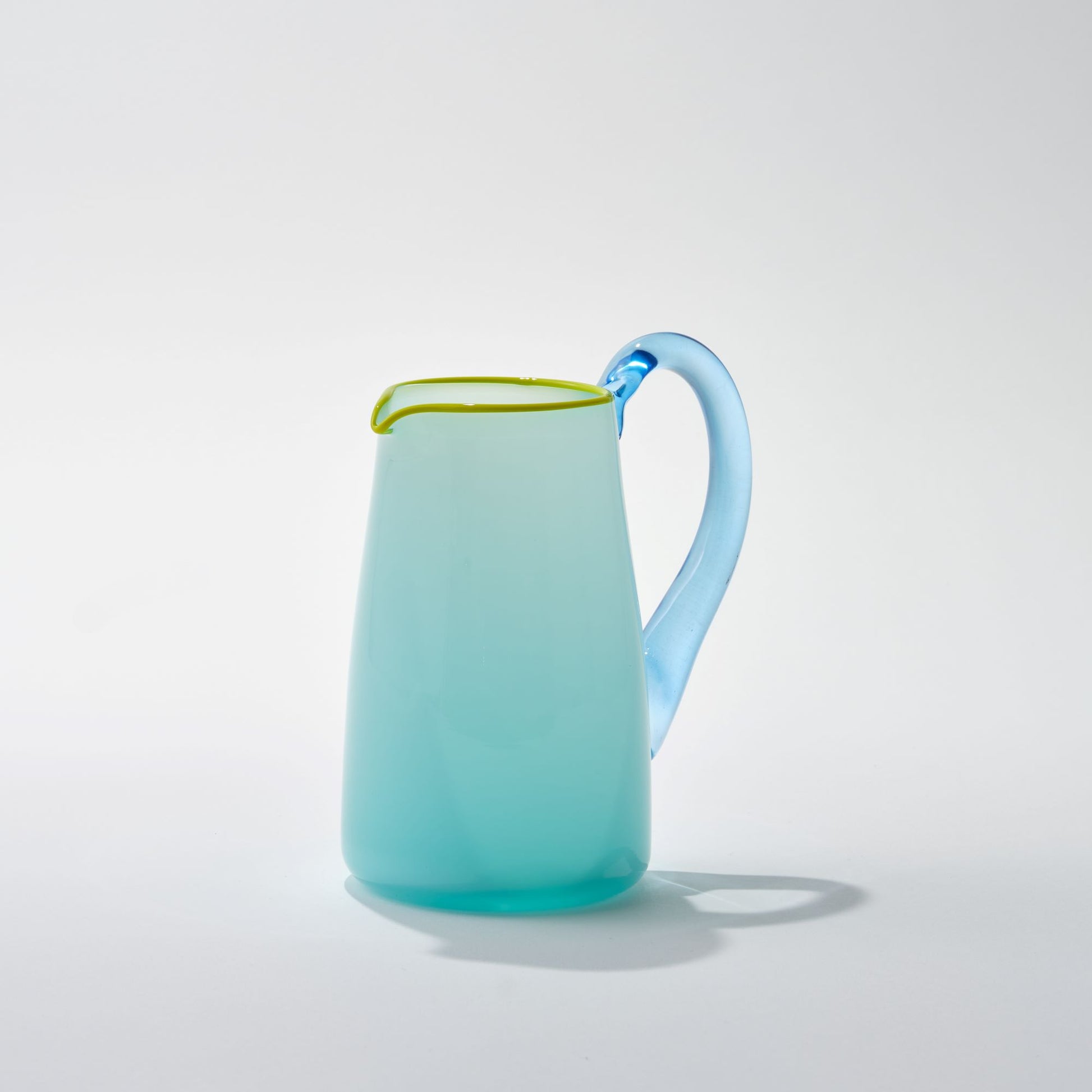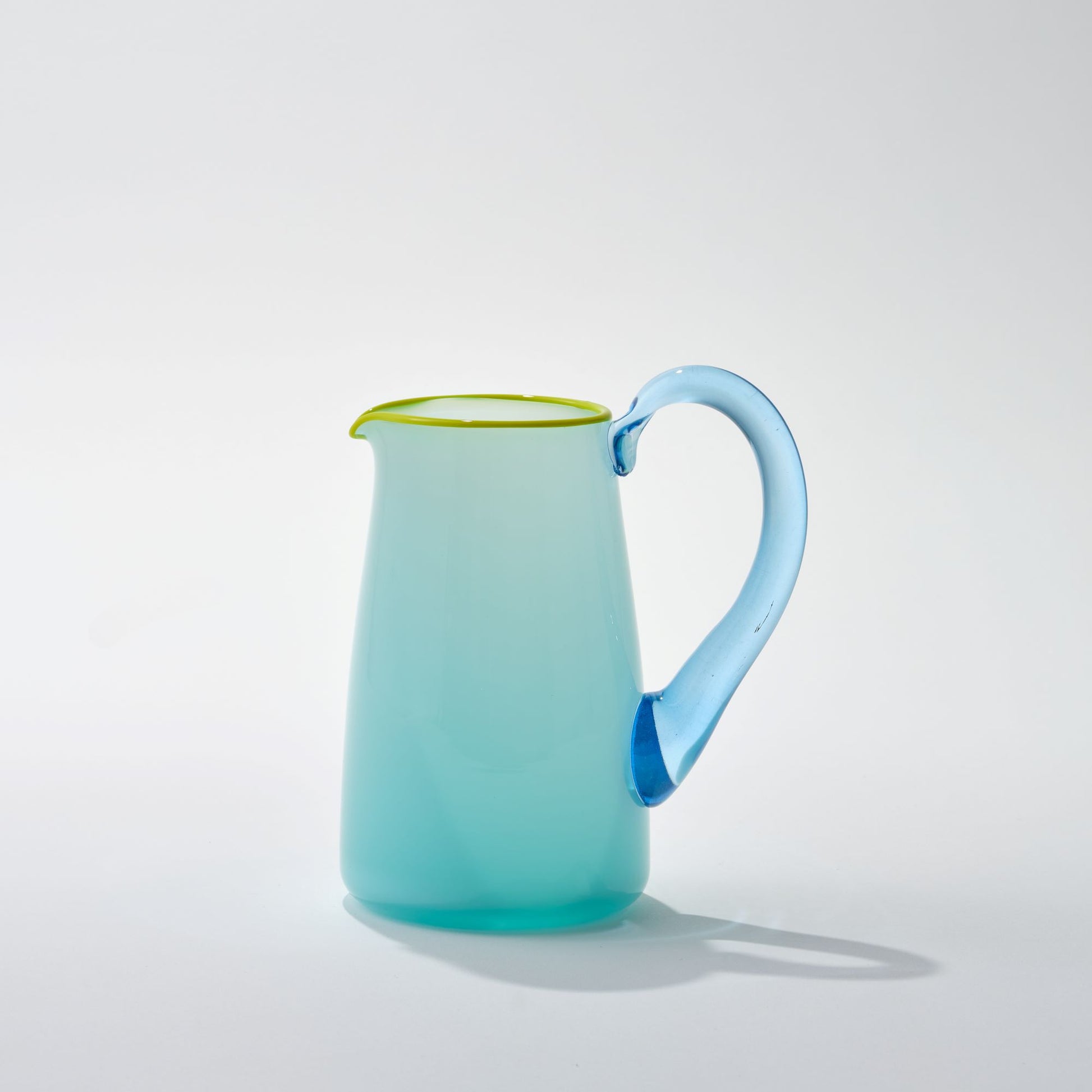 Hand blown, delft blue milk jug featuring an aqua blue handle and celadon lip.