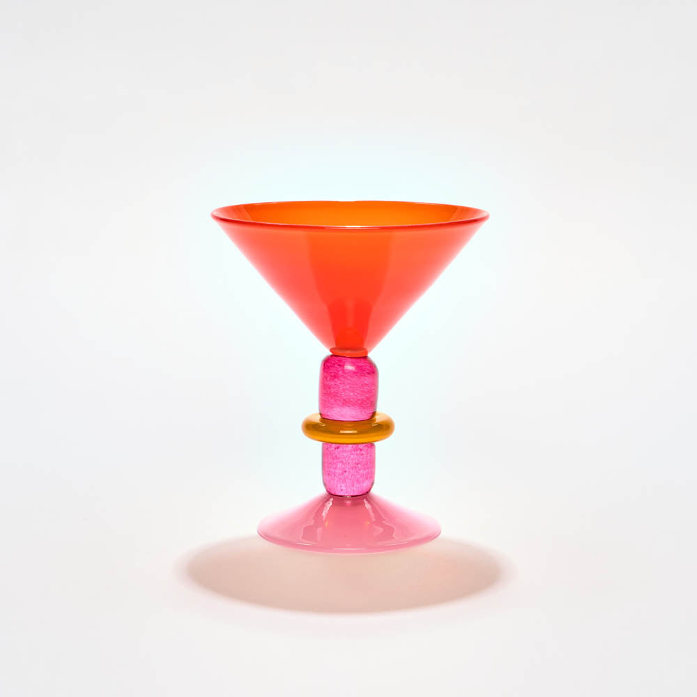 The glass has an opaque red body, a translucent pink and orange stem and pale pink blown foot.