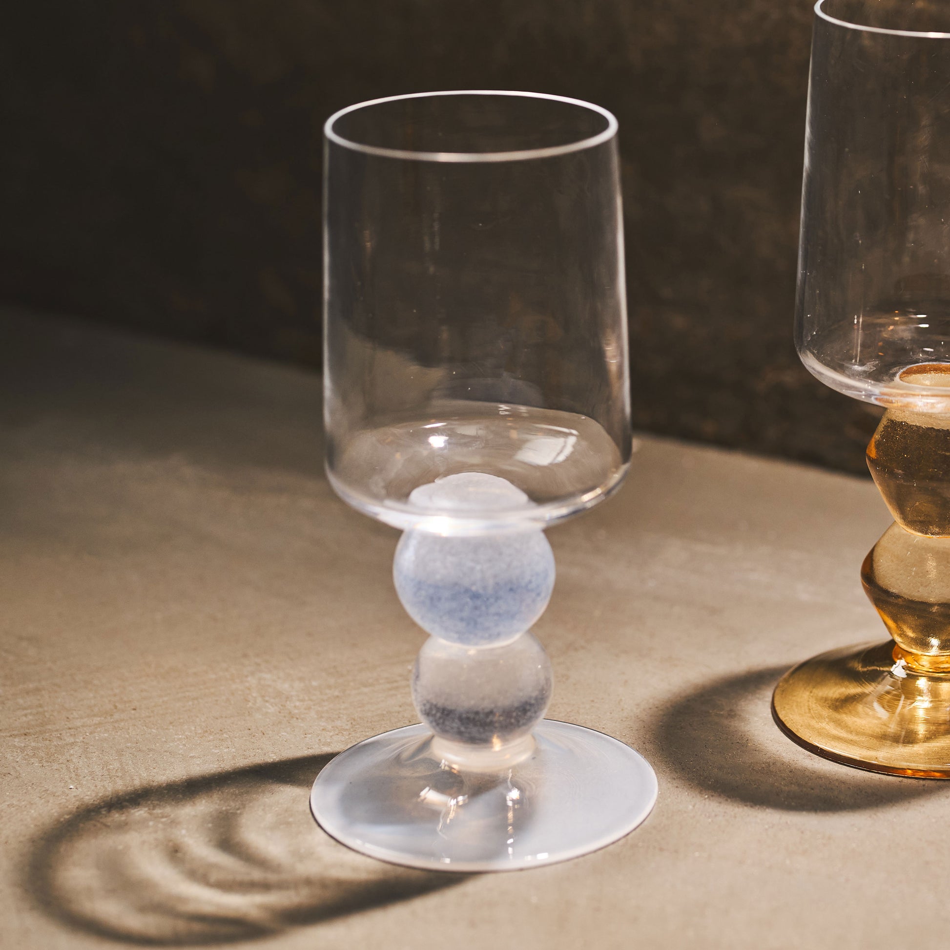 Each glass features a handblown stem stacked with spherical and diamond forms, finished with a matching glass foot and a clear bowl. The result: an opulent yet timeless silhouette that feels as good in the hand as it looks on the table.