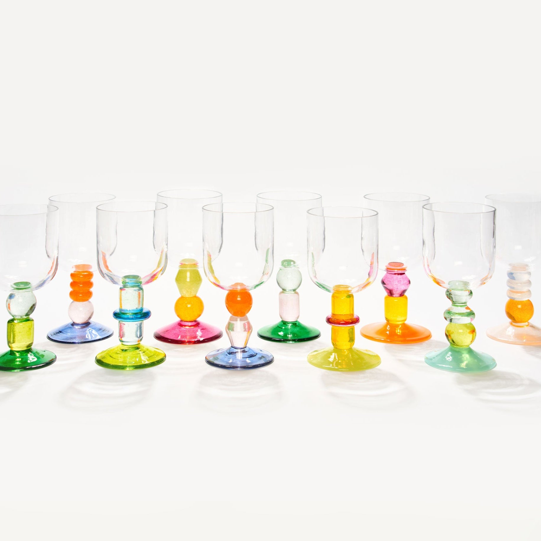 Meet the curvier, more generous version of our classic Miami Wine Glass, now in a set of 10. Each glass has a soft, rounded bowl and a stacked, handblown stem in candy-inspired colours.
