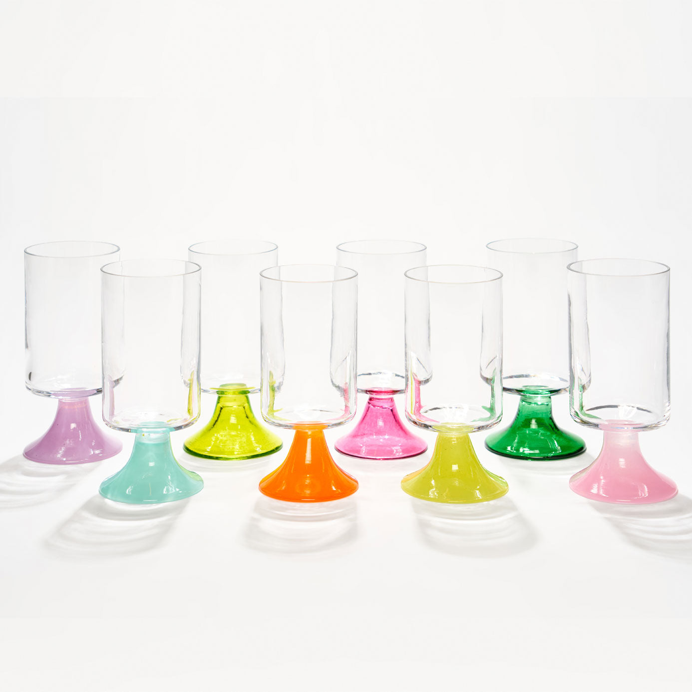 Sweet, shapely, and ready for any occasion, the Miami Darling Glass is now available as a set of 8. Each footed glass features a handblown stem and foot in playful colourways, making it easy to mix, match, and personalise your table setting.