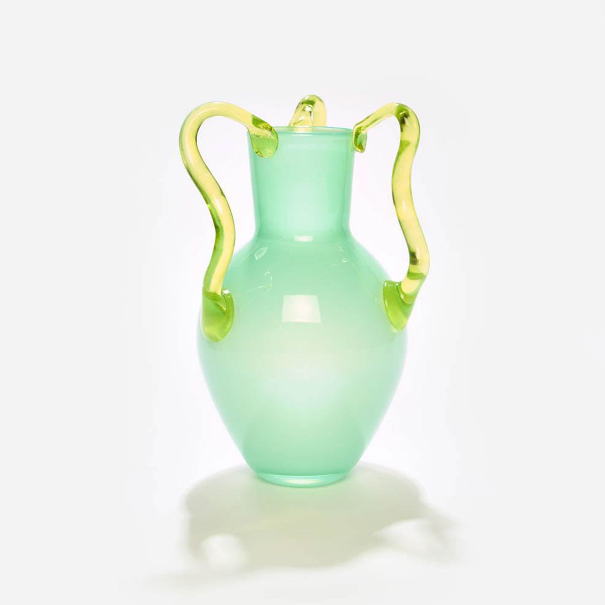 The body of this vase is a soft opaque green with lime green transparent wiggly handles.
