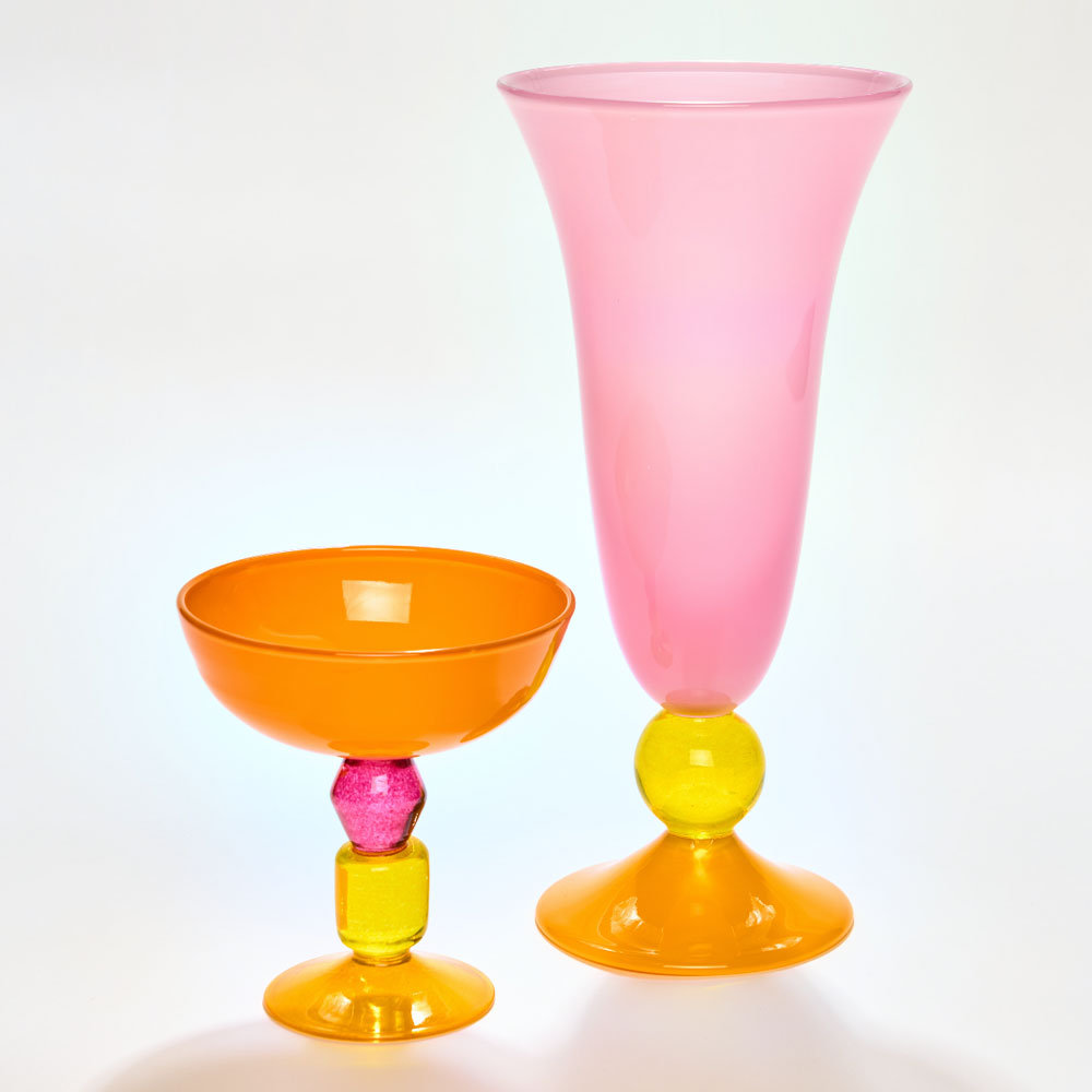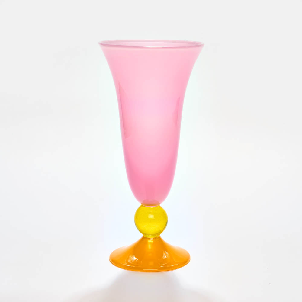 Each piece is handmade in our glassblowing studio in London. The hot pink vase has a pink body, yellow ball stem and mandarin foot.