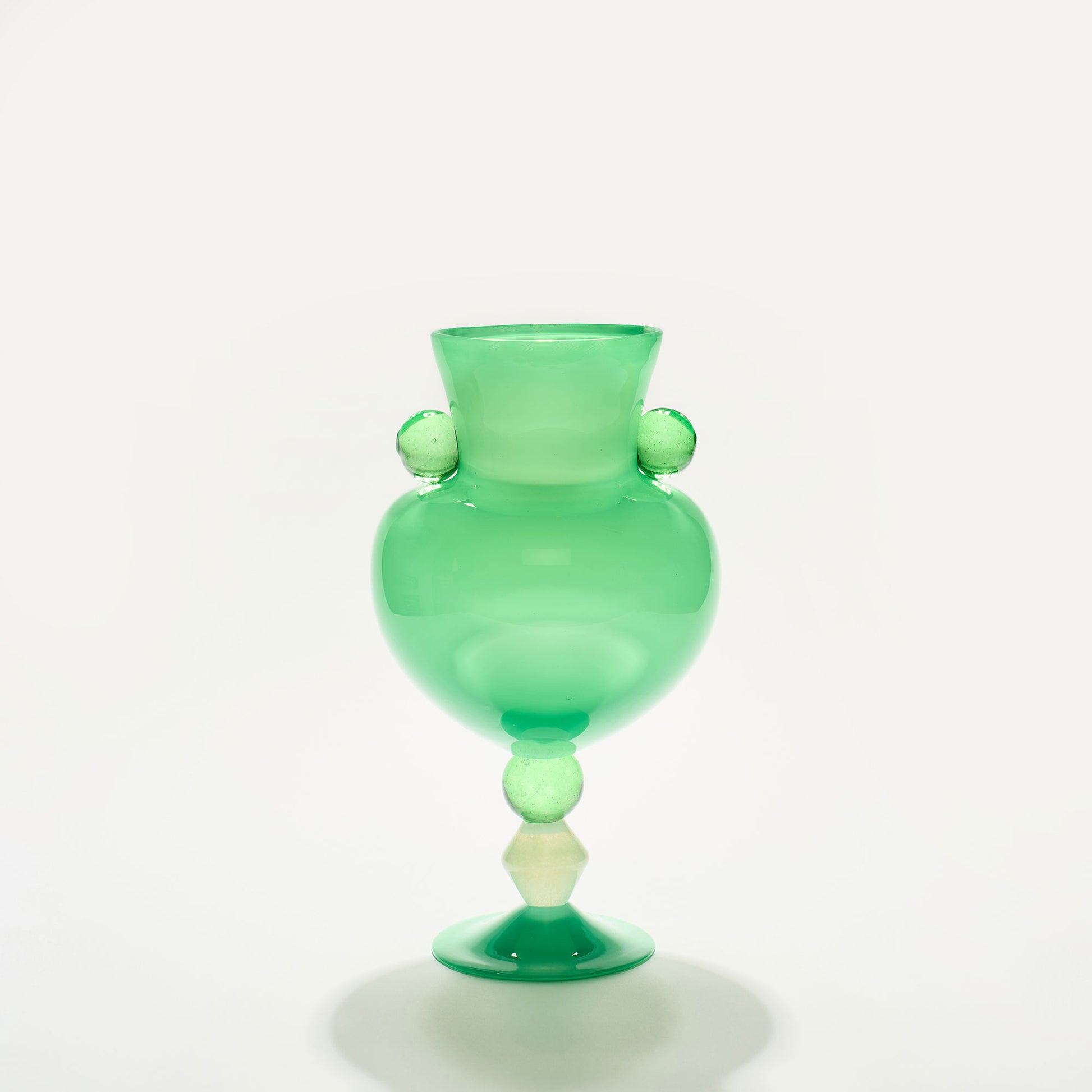 The exaggerated shape is created by blowing bold colours of glass which is then joined with solid worked glass for the handles and stem. The Verona vase makes the ultimate centrepiece in a home and is a formal nod to history.
