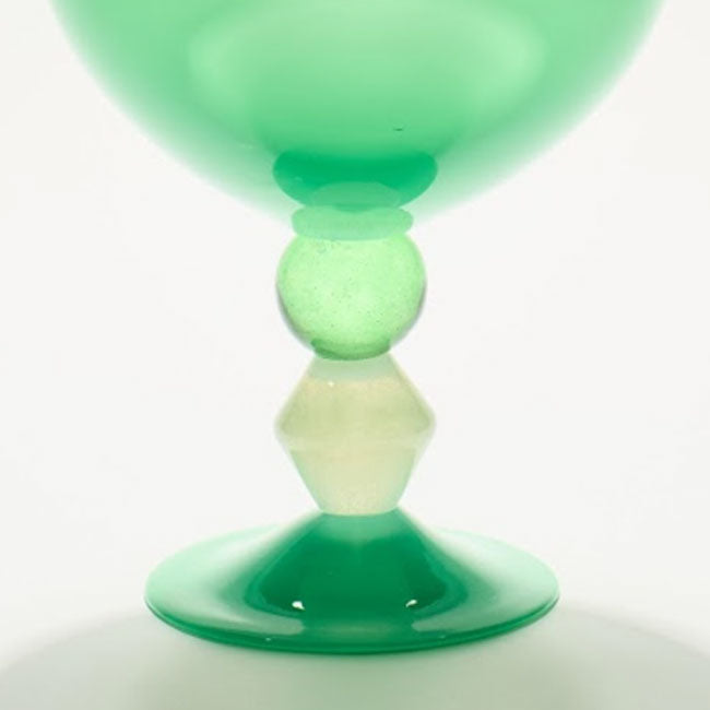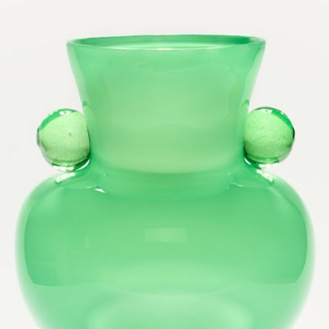 The body of this vase is a soft opaque jade with transparent jade handles, stem and blown foot.