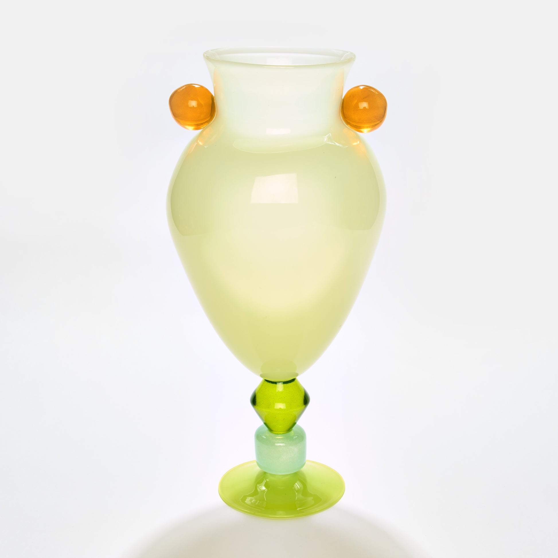 The body of this vase is a soft opaque green with vibrant orange handles and apple green stem and blown foot.